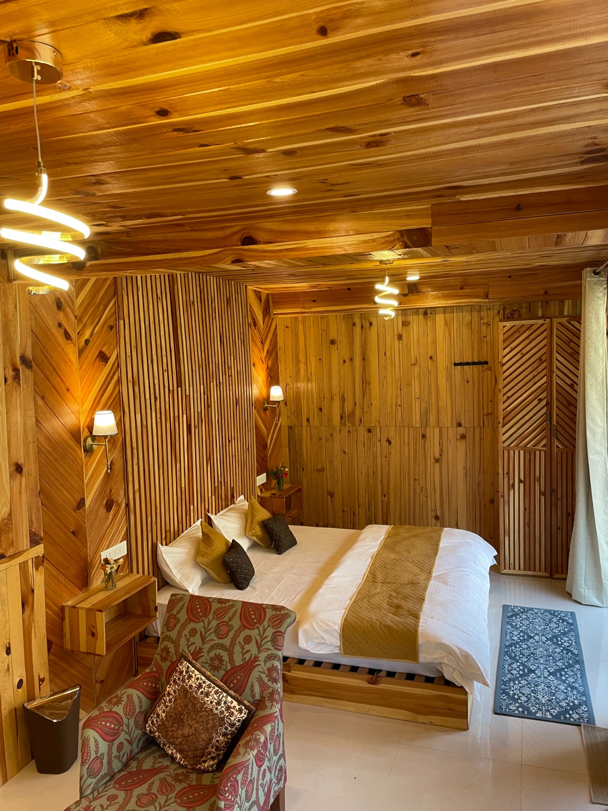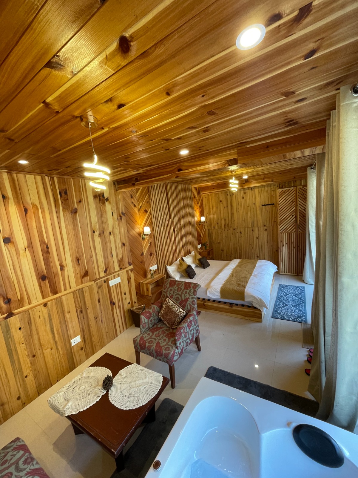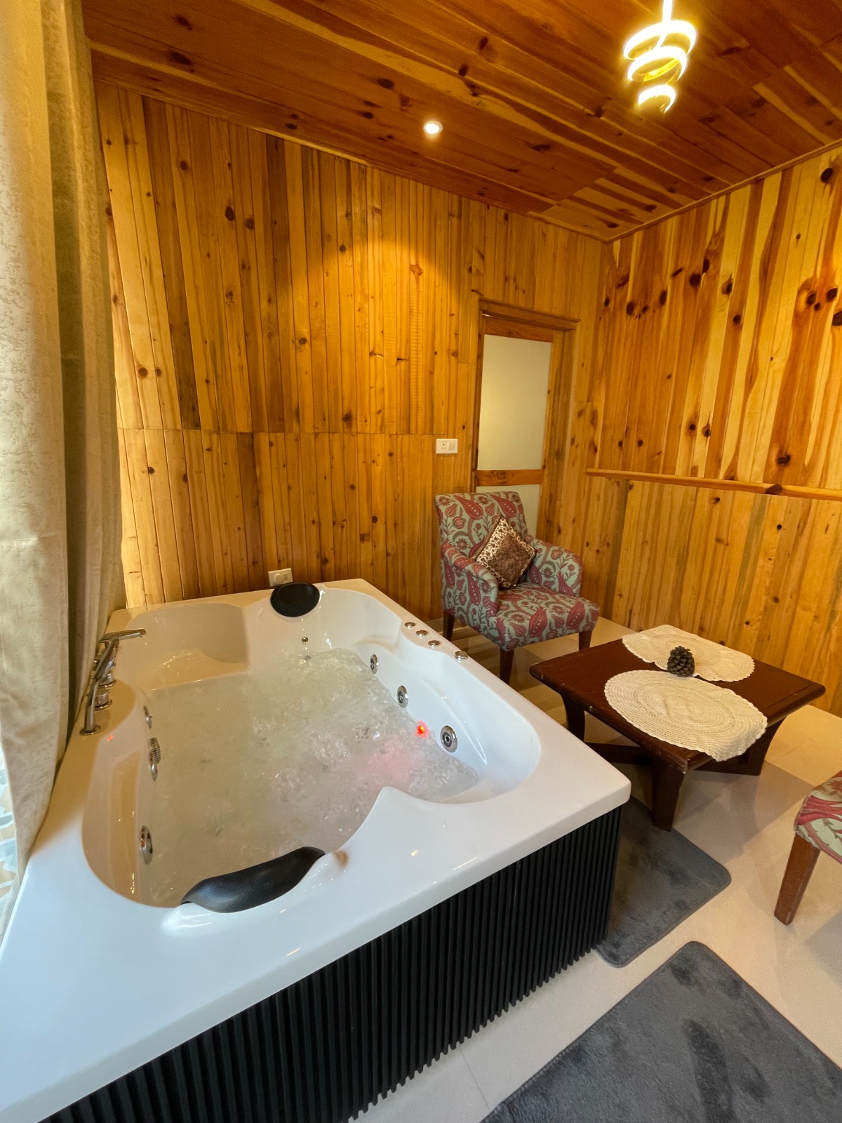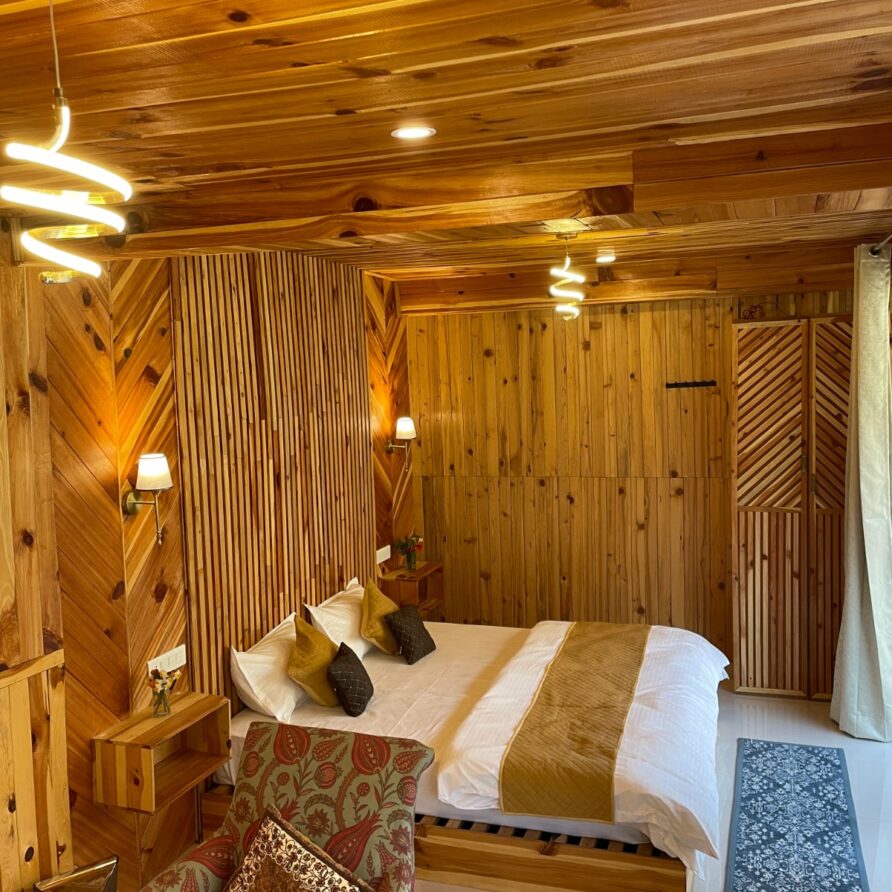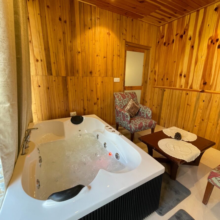 A serene glass house with a private jacuzzi, located within the peaceful grounds of Tirthan Chalet. Surrounded by a persimmon orchard and mountain views, this stay is perfect for couples seeking privacy, nature, and slow living in Tirthan Valley.